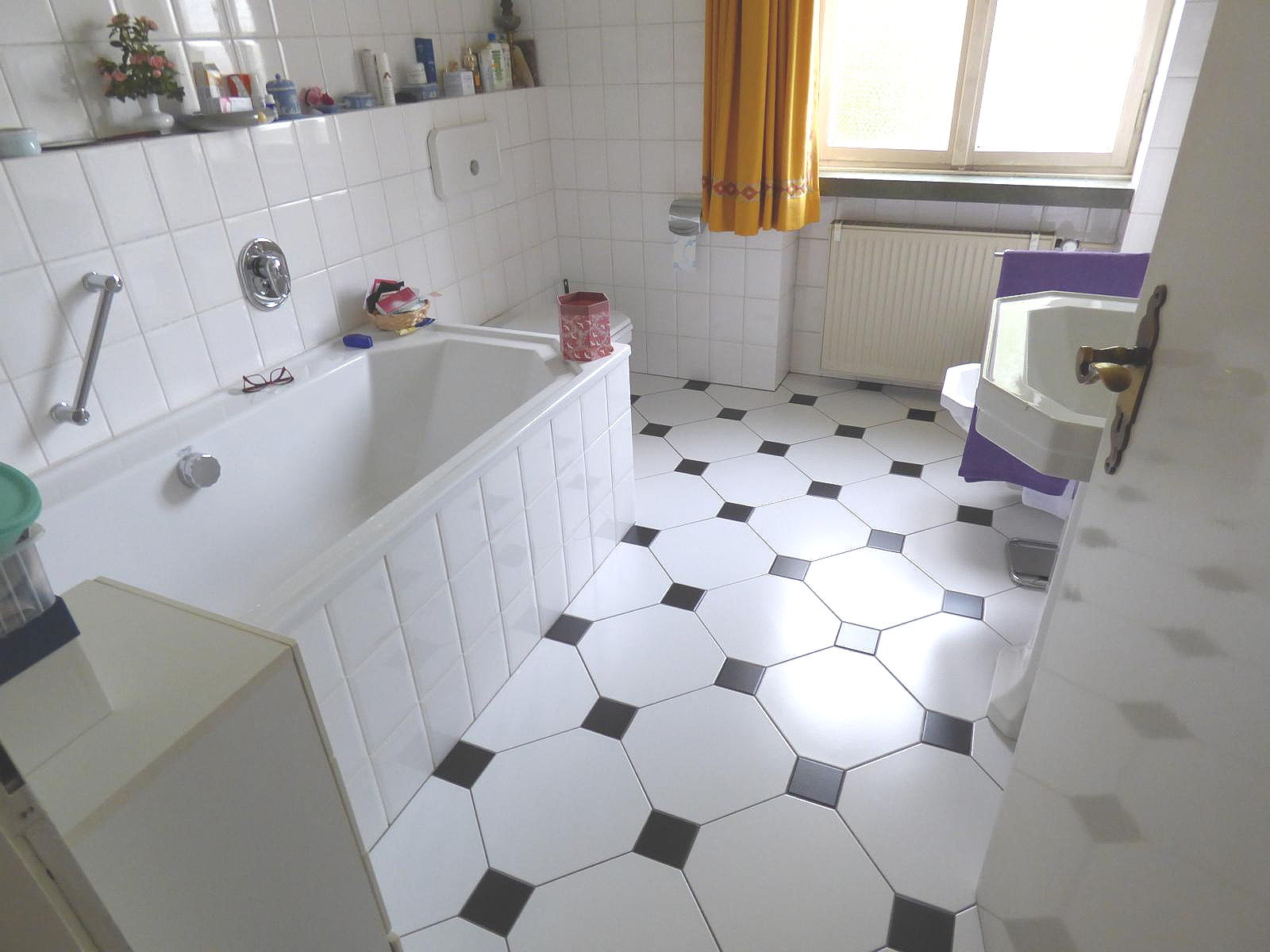 - Erneuerung der Bäder mit weißen Fliesen an den Wänden, auf dem Boden weiße und schwarze Fliesen im Verbund, Einbau weißer Keramik