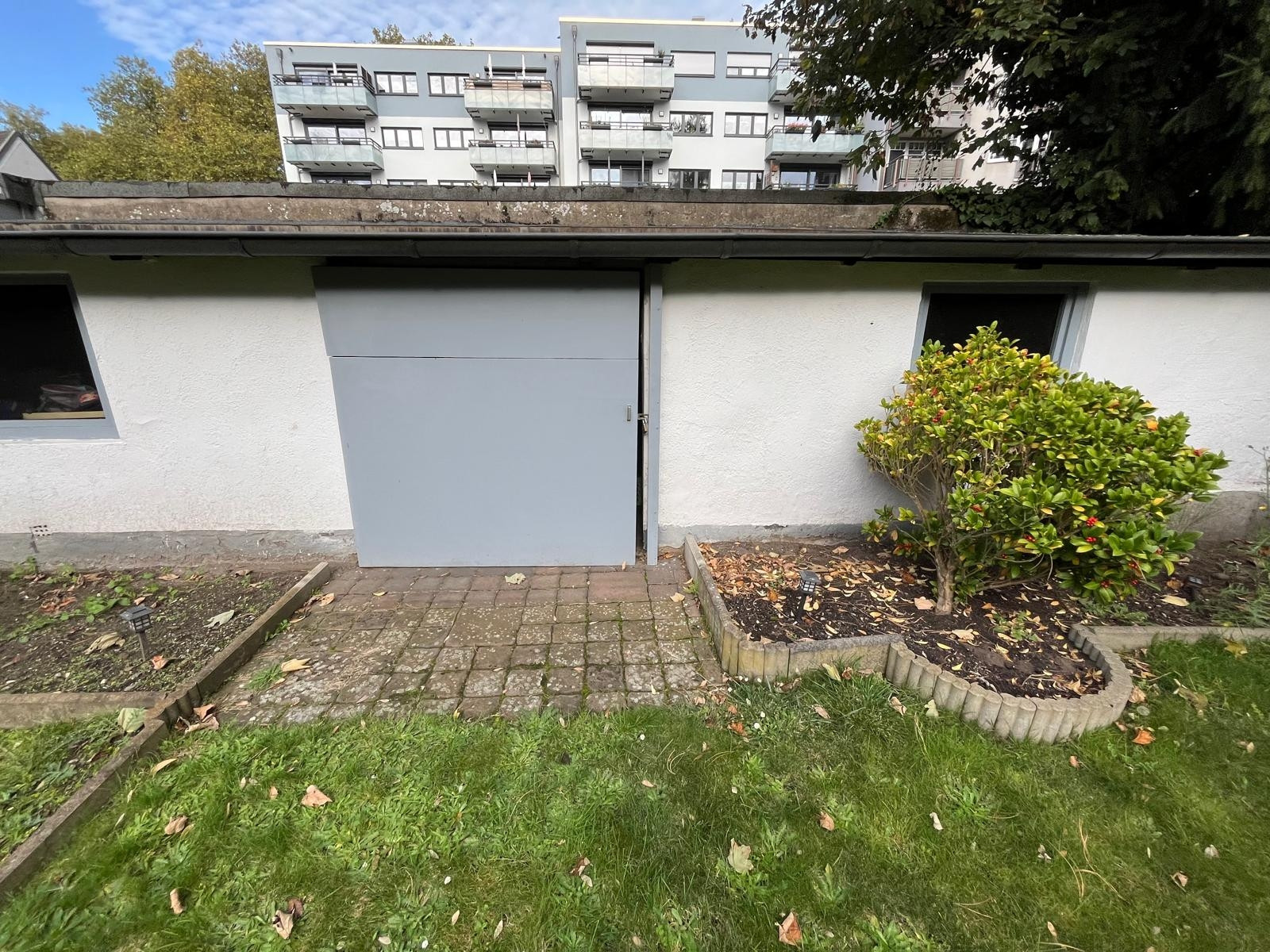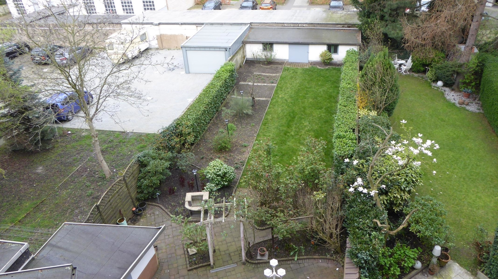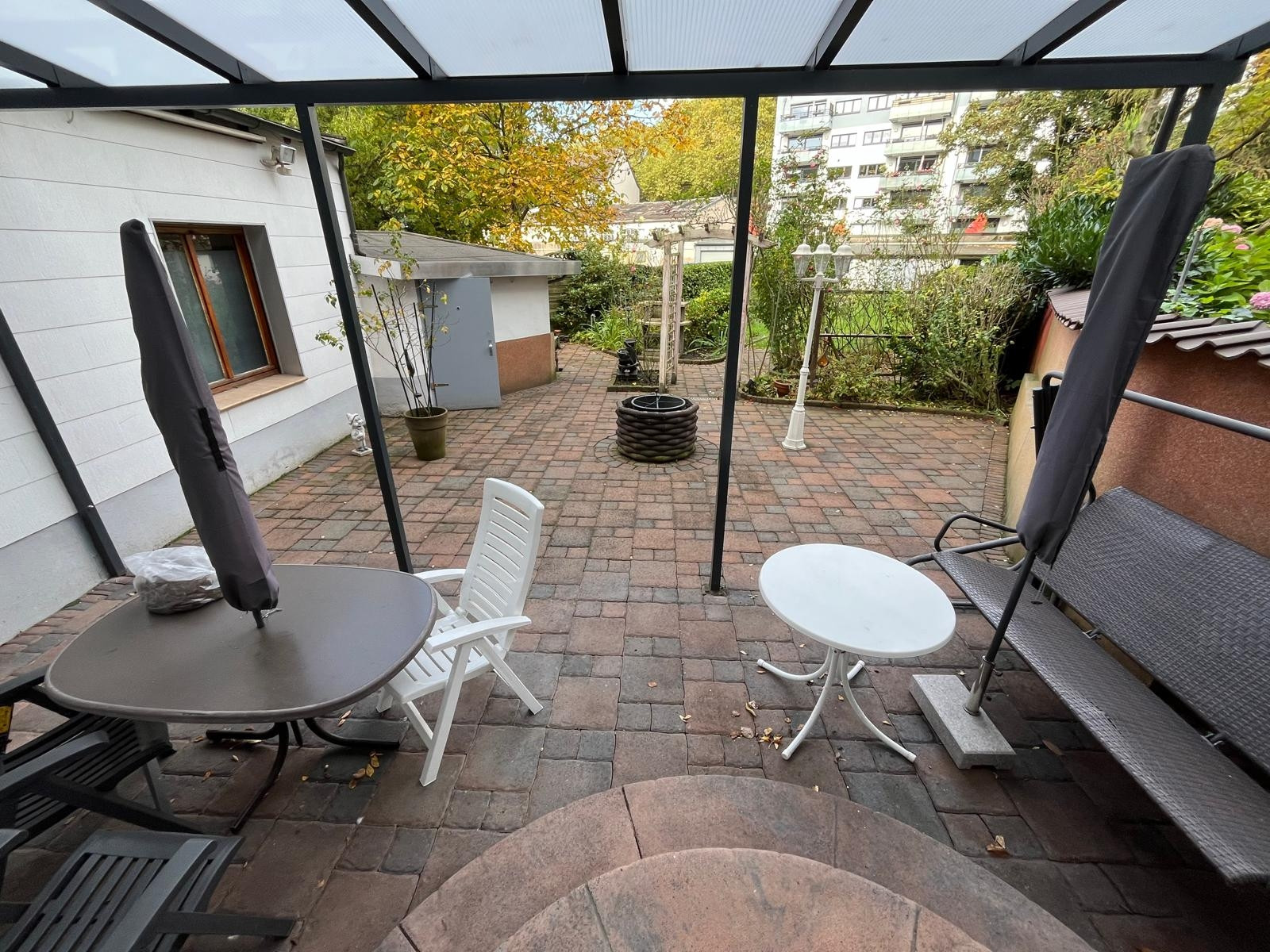 Der Garten umfasst eine überdachte Terrasse, die sich ideal für gemeinsame oder private Nutzungen eignet. Zudem gibt es zwei praktische Schuppen, die zusätzlichen Stauraum bieten.