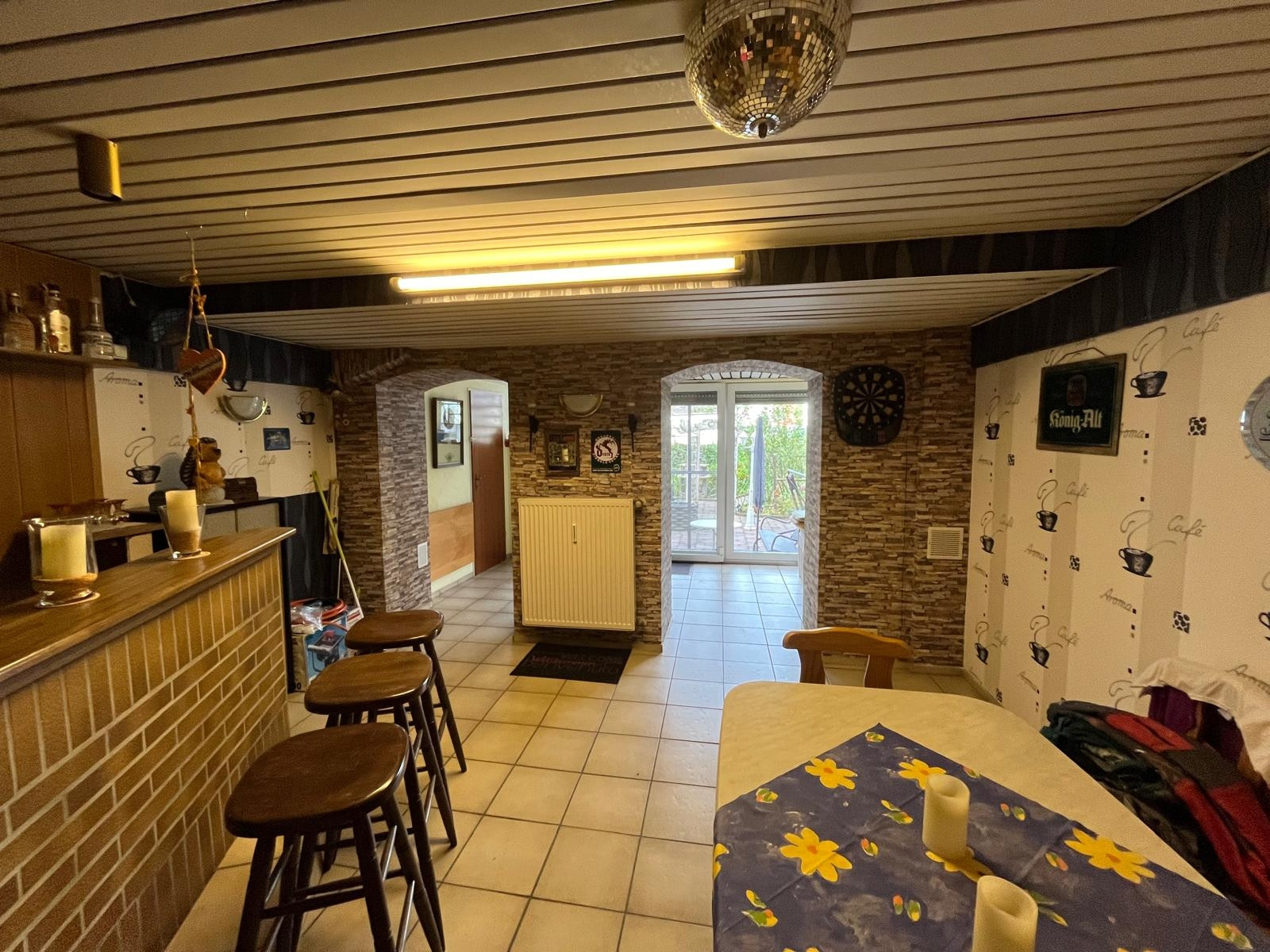 Kellerflur, Partykeller mit separatem WC, Kellerabteile für die Mieter, ehemaliger Kiosk mit eigener Küche und WC, vielseitig nutzbar (aktuell Stellplatz für Mülltonnen und Fahrräder)