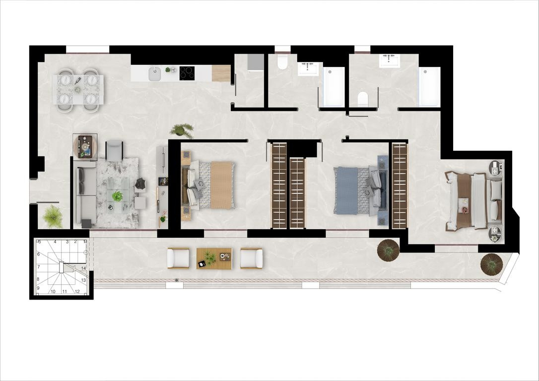Die Balkone / Terrassen haben eine Größe von rund 9 m² bis 100 m².